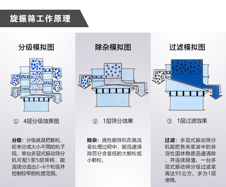 旋振篩是由直立式電機(jī)作激振源,電機(jī)上、下兩端安裝有偏心重錘,將電機(jī)的旋轉(zhuǎn)運(yùn)動轉(zhuǎn)變?yōu)樗?、垂直、傾斜的三次元運(yùn)動,再把這個運(yùn)動傳遞給篩面。調(diào)節(jié)上、下兩端的相位角,可以改變物料在篩面上的運(yùn)動軌跡。