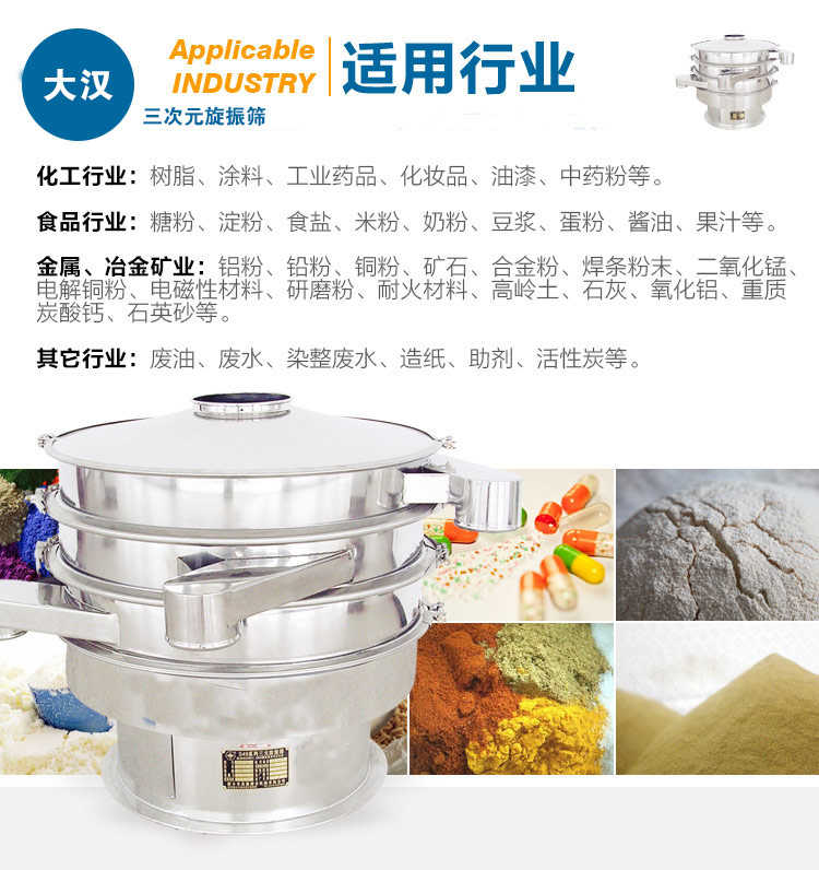 旋振篩是一種高精度細(xì)粉篩分機(jī)械,其噪音低、效率高,快速換網(wǎng)需3-5分鐘,全封閉結(jié)構(gòu),適用于粒、粉、粘液等物料的篩分過濾。那么旋振篩具體適用于哪些行業(yè)呢?今天小編為大家介紹其行業(yè)如下所示
