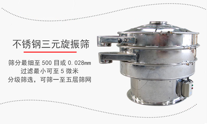 不銹鋼振動(dòng)篩三元旋振篩篩選顆粒、粉末、粘液一定范圍內(nèi)均可篩選。篩分細(xì)至500目或0.028mm, 過(guò)濾小可至5微米。分級(jí)篩選,可篩一至五層篩網(wǎng),能同時(shí)進(jìn)行二至六個(gè)等級(jí)的分選或過(guò)濾。
